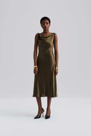 The Zerea satin midi dress is a perfect for any occasion with a softly draped neckline and flowy hemline, giving this piece a beautiful feminine look. The adjustable tie straps create flexibility for the neckline to change from a soft draped cowl to an asymmetric off the shoulder look, allowing this dress to have a timeless appeal.