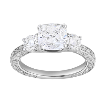Refined and captivating the Zarelle engagement ring features a stunning cushion cut lab grown diamond set in polished 14K gold. The softly rounded edges of the cushion cut combined with its brilliant facets create a beautiful balance of classic charm and radiant sparkle. The center diamond is complemented by two round side diamonds that enhance the overall brilliance while adding symmetry and elegance to the design. This timeless three stone setting not only elevates the sparkle but also symbolizes the journey of past present and future. The band is adorned with intricate vintage inspired engraving along the shank adding depth and character that gives the ring a romantic antique inspired feel while maintaining a refined modern presence. Graceful and meaningful the Zarelle ring is a beautiful expression of love and commitment making it an exceptional choice for engagements anniversaries and life's most memorable moments. Diamond carat weight may vary up to 2.65 carats from the stated weight. Made in U.S.A. The ring is accompanied with an IGI certificate guaranteeing authenticity and with the certificate number inscribed within the band.