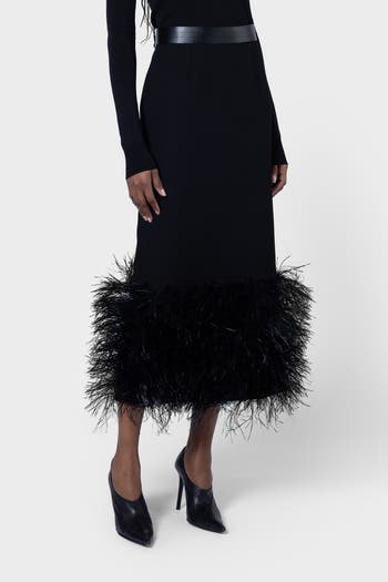 Fitted and striking, the Zari skirt is a mid length wool blend skirt. Finished with layers of raffia detailing to the the hem.