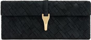 Geometric hardware highlights the intricately woven exterior of a faux-suede clutch featuring a slender profile perfect for your next evening out.