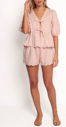 Flowy, fun and ready for anything, this linen-enhanced set features a puff-sleeve peplum top secured with sweet ties and matching scalloped shorts with pockets.