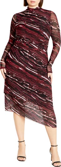 An energizing abstract print emboldens this stretchy mesh dress made with an edgy back cutout and a sleek bias-cut hem.