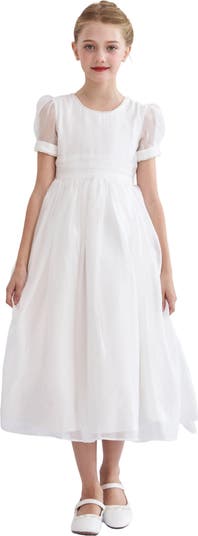 - 100% PolyesterFormal gown with round necklineShort puffed sleeves with banded cuffsFitted bodice with structured waistband detailFlowing ankle‑length skirt with layered sheer overlayElegant design for weddings, communions, and ceremonial occasionsImported