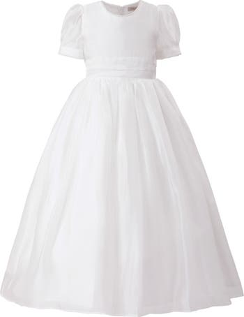 - 100% PolyesterFormal gown with round necklineShort puffed sleeves with banded cuffsFitted bodice with structured waistband detailFlowing ankle‑length skirt with layered sheer overlayElegant design for weddings, communions, and ceremonial occasionsImported