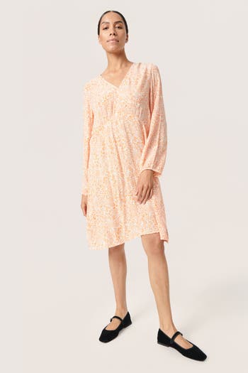 The Zaya dress is a simple and relaxed dress in a light, crinkled fabric, and it is the perfect addition to this seasons wardrobe. It has a V-neck and a casual and loose fit with a peaked waistline. The dress is cut at the knees and it has long and loose-fitting sleeves.