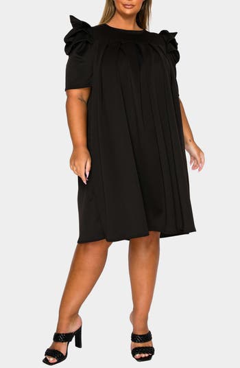 Pleats further the swingy silhouette of this jersey dress accented the dramatically puffed sleeves that makes it a fashion-forward stand out.