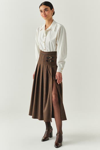 The Checked Midi Skirt combines a checked finish. The fluid fabric gives it an easy drape. It pairs easily with simple knits, shirts, or blouses for both casual and polished dressing.