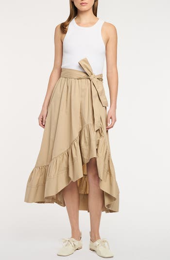 A ruffled hem provides a dynamic finish for this sleeveless A-line dress cinched with a matching tie belt.