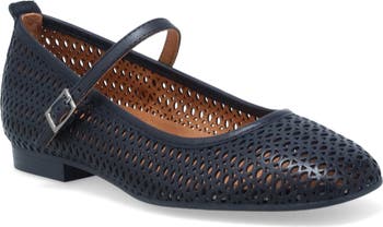 Laser-cut perforations and a square toe bring crisp angles and dimension to a leather mary jane featuring a cushioned footbed and flexible sole.