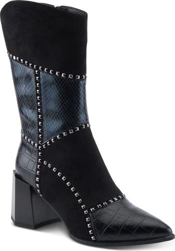 Croc and snakeskin embossing bring wild texture to a boot topped with a playful mixture of panels and bordering studs.