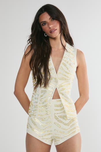 Make a dramatic entrance in this eye-catching Zebra Hotfix Tailored Vest from Nasty Gal. The dazzling diamante embellishment creates a mesmerizing zebra pattern that demands attention on the dance floor. The tailored fit and plunging neckline create a flattering silhouette that works brilliantly for evening drinks. Complete the look with chunky boots for an edgy contrast, or swap for strappy heels to dial up the glamour.