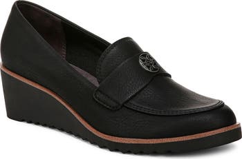 A brushed ornament at the instep details a sophisticated loafer set on a cushioned footbed and chunky wedge heel.