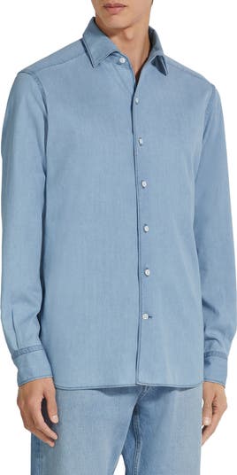 A hint of cashmere brings refined softness to a cleanly styled, finely woven denim button-up shirt that's a staple for any season.
