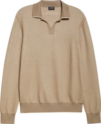Renowned for its luxurious fabrics and timeless essentials, this Italian label presents this long-sleeve polo-sweater crafted from a blend of silk and cashmere yarns.
