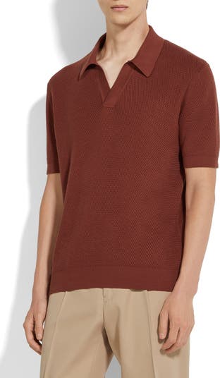 A sporty thermal texture knit with premium cotton keeps the feel casual and comfortable in a polo-sweater rendered in a versatile orange hue.