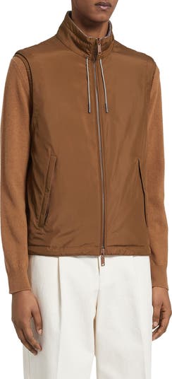 A reversible design doubles the styling potential of a lightweight vest detailed with a two-way zipper and a stand collar.