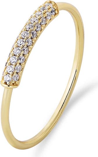 The Zein Ring is the perfect skinny stacking ring! The ring features a gold band with a micro pave bar in the center of the ring. The ring can be worn along for a classic look or stacked with some of our other stacking rings!