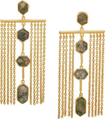 - Design: Drop earrings with moss agate and chain details