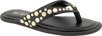Brushed metal studs in varied sizes embellish the straps of this sophisticated flip-flop fashioned with comfortable flared straps and set on a textured sole.
