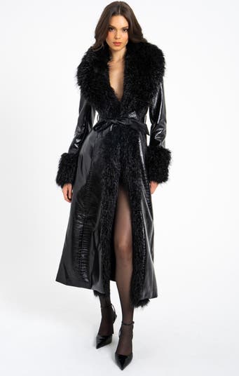 Zella Longline Vegan Croc Leather Coat with Fur Trim