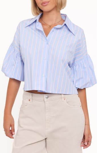 Elbow-length puffed sleeves give a charming update to this striped cotton-poplin button-up cut to a slightly cropped length.