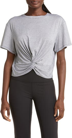 Slim stripes softly pattern an action-ready top with twisted detailing at the front and a breathable knit.