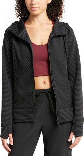 Wide ottoman ribbing updates a lightweight hoodie that zips at the front and is finished with a drawstring hood.