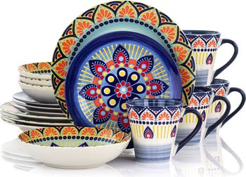 The Elama Zen Blue Mozaik 16 Piece Dinnerware Set is a lovely addition of color for your table. Whether you choose to host a large party or enjoy an intimate meal in your home, these plates will brighten up your day with colorful and vibrant tones and intricate bohemian style. While this dish set for 4 is a wonderful way to serve many meals, it's designed to be versatile and can easily double as serving-ware. This stoneware collection is also both dishwasher and microwave safe making clean up and reheating simple and efficient.