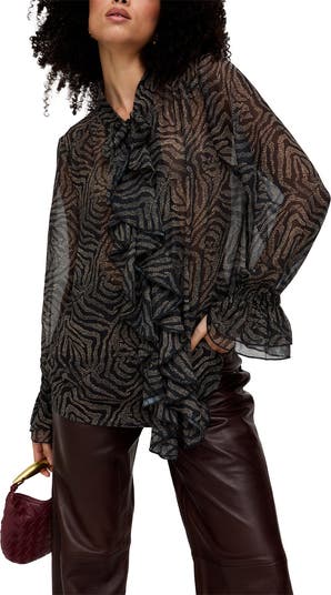 Lily and Lionel London Zendaya Ruffle Detail Zebra Print Shirt, Alternate, color, Black