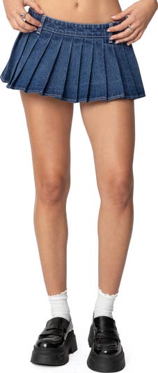 Abundant pleats add plenty of preppy vibes to a nonstretch-denim skort in a flirty mini length.