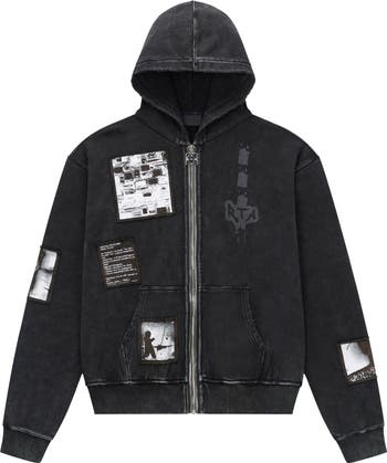 A zip hoodie brings streetwear edge to an everyday staple, cut from lightly distressed cotton with a split kangaroo pocket. Graphic patches, an MP3-player zipper pull and a pixelated logo add bold, tech-inspired attitude.