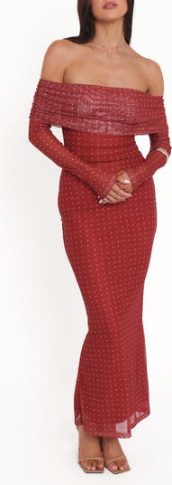 Stretchy mesh hugs your curves as you move in this shoulder-baring maxi dress patterned in little polka dots.