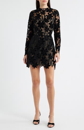 Midnight blooms tell a smoldering style story for a lacy, leg-baring cocktail dress that will be the topic of cocktail chatter.