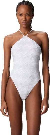 Zig Zag Lamé Viscose One-piece Swimsuit With Halter Neck