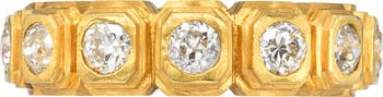 Round-cut diamonds in vintage-inspired bezel settings illuminate an eternity band ring crafted in the USA from gleaming 18-karat gold. A brushed satin finish adds to its glamorous appeal.