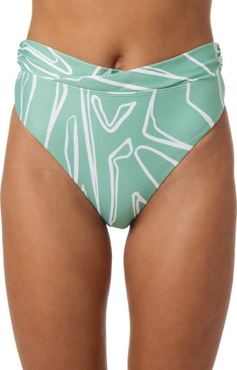 A crossover high waist tops these geometric-patterned bikini bottoms featuring high-cut legs and shirred sides.