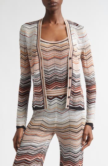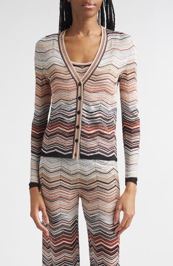 The classic Missoni zigzag knit is rendered in earthy green and blue hues and highlighted by sparkling metallic fibers for a stunning—yet so simple—cardigan.