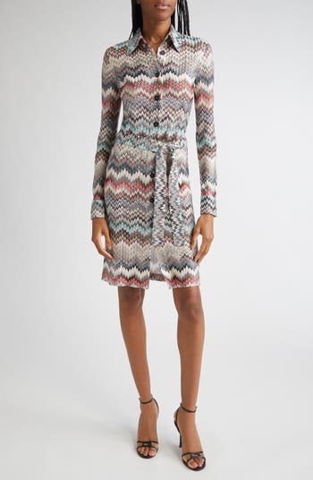 Iconic since their '60s debut, Missoni's signature zigzags bring kaleidoscopic color to this retro-eclectic shirtdress in an openwork raschel knit meant to mimic the scales of snakeskin.