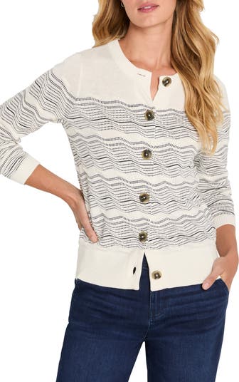 Fashioned from crisp linen-blend yarn, this lightweight cardigan is patterned with dotted stripes turned zigzag with textural knit tucks.
