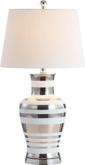 Our modern take on a classic lamp features silver stripes on a white ceramic base. Try a pair of these fresh, modern lamps in a bedroom, living room, or entry console. Add sparkle to a Hollywood Regency room; the drum shade suits modern interiors. Includes an energy-saving LED bulb.