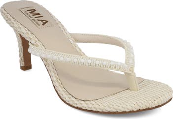 Shiny beads bring a twinkle of glamour to a breezy sandal covered in woven raffia and lofted by a kitten heel.