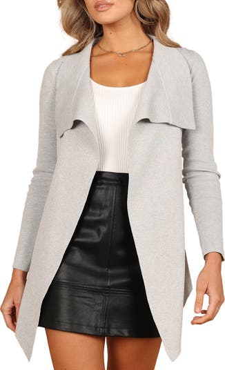 This longline cardi is knit with a drapey wing collar and a defining tie belt.