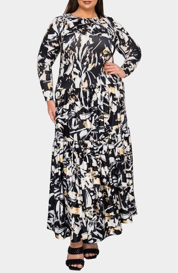 A bold abstract print and a tiered, flowy silhouette brings the drama on this long-sleeve maxi dress made from stretch-kissed jersey for a comfortable fit.