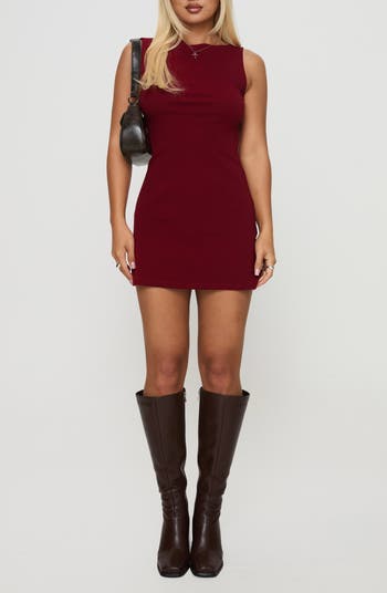 A bateau neck is balanced by a stem-baring hem on a figure-skimming minidress made from stretch-enhanced cotton for easy movement.