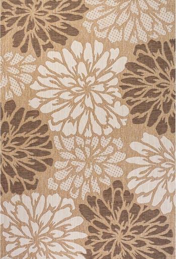Add some graphic punch to your porch or patio with the bold blooms on our modern floral rug. The large-scale pattern has a geometric effect in a simple palette of sage green, brown and beige. The flatweave design is great for high-traffic spaces indoors too.
