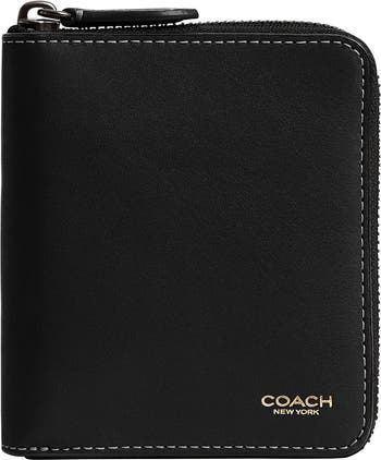 Contrast topstitching trims the natural-grain leather exterior of a compact wallet perfect for securing your monetary essentials.