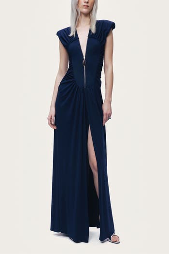 The softly structured shoulders and gathered waist enhance the form, while the front slit adds fluid movement and modern elegance.