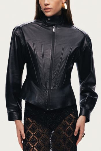 A sleek leather jacket defined by a sculpted, fitted silhouette and clean zip-front design that accentuates the waist. Style with a statement skirt for an elevated evening look or pair with tailored trousers for a modern, polished finish.
