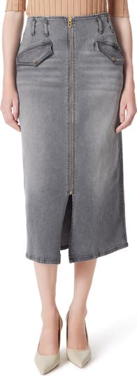 Gleaming goldtone hardware heightens the modern attitude of this beautifully washed denim skirt that has chic whiskering and a front slit for easy movement.