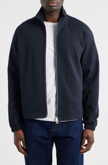 A wind-blocking mock neck tops this slim, cotton-blend sweatshirt with bright contrast stripes racing down the front zip.